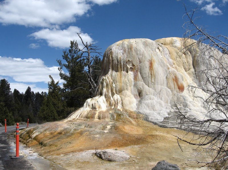So. Where was I? Oh, yes. Scraping frost in my heavy coat. In early September. Anyway, I headed into the park and promptly saw a pair of sandhill cranes along the Madison River, who flew away before I had a chance to take their picture, then headed north towards Norris and Mammoth Hot Springs. On the way, I stopped to walk the trail to Artist Paintpots, which I remembered from the "ex" visit as being these beautiful pools plopping in the trees, but which had been hit by the 1988 fires, and now were in an open meadow with dead snags scattered about. The paintpots themselves were still beautiful, though.